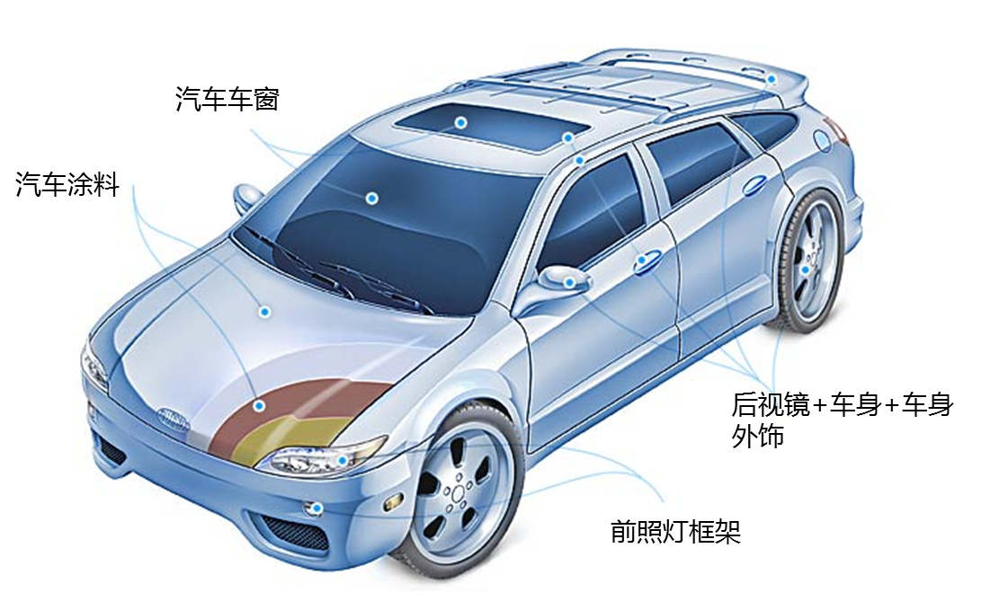 汽车前照灯框架常采用热塑性塑料经过表面涂装。常用的材料为PC、PBT、ABS等。