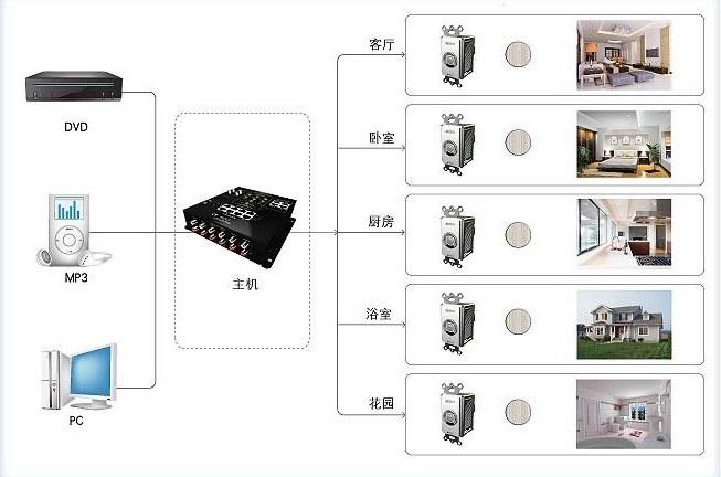乐。各房间独立的控制面板,可以对每一个音源进行调节。并且隐形安装,节约空间。系统拓扑图如下: