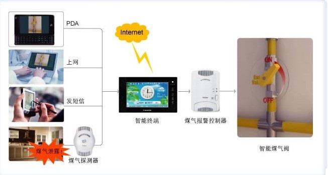 当忘记关闭煤气阀,系统将发送报警信息至业户手机,业户可通过手机短信、网络等方式关闭煤气阀;当有煤气泄漏,系统发送报警信息通知业户,并自动关闭煤气阀。系统示意图如下:
