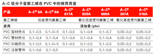 A-C 聚乙烯蜡提供大量的低分子量聚乙烯蜡均聚物和氧化聚乙烯蜡,可用于PVC 制造过程。其基本的作用相当于外部润滑剂,同时还可实现很多其他的好处。