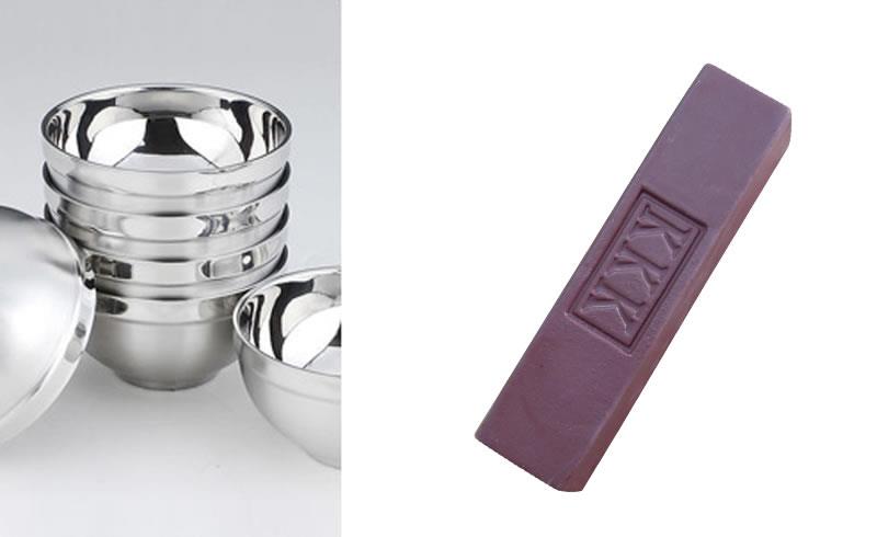 紫蜡由松香、凡士林、石蜡、棕刚玉微粉或磨削力较强氧化铝粉、氧化铁红等配合而成。主要成分是棕刚玉微粉或氧化铝粉。其一流的性价比深受广大中端表面抛光处理厂家欢迎,适用于一般钢材如不锈钢,铁,铜,铝等金属进行粗至中度研磨,对工件磨削力与打磨后工件光亮度兼顾完美,能强力去除工件表面砂眼,氧化皮等,通常配合麻轮使用,服务于锈钢餐具,刀具,橱具,钟表等抛光客户群。