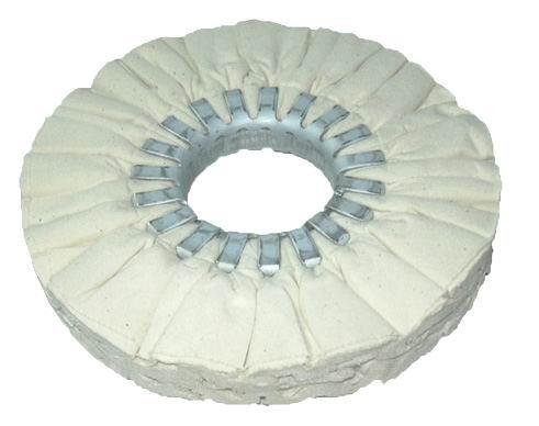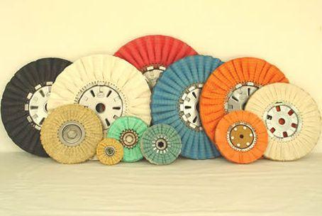 布轮,字面意义就是用布做成轮式用来抛光,其为抛光机器常用材料之一。其结构分为三种:1。非缝合式整布轮。多用细软棉布制成,宜抛光形状复杂工件,或用于小型工件的精抛光。 2。缝合式。多用粗布、无纺布及细平布等制成,缝线可采用同心圆式螺旋式及直辐射形式,宜抛光各种镀层及形状较简单的工作。 3。风冷布轮。采用45度角线裁法,呈环形皱褶状,中间装有金属圆盘,具有通风散热的特点,宜抛光大型工件。