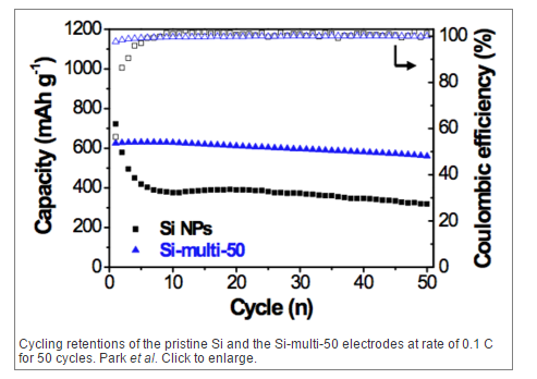 韩国研究人员设计出一种新型的硅基多组分负极材料,表现出了优异的电化学性能。容量达到1000mAh/g,1C倍率充放 电1000次循环后容量保持率为65%,10C循环时仍有800mAh/g的优异的倍率性能,100次循环后体积仅仅膨胀了12%。该团队利用硅作为芯 材,在表面包覆多层多组分的外壳(硅酸锂和钛酸锂),该外壳能够明显减少硅负极电池...