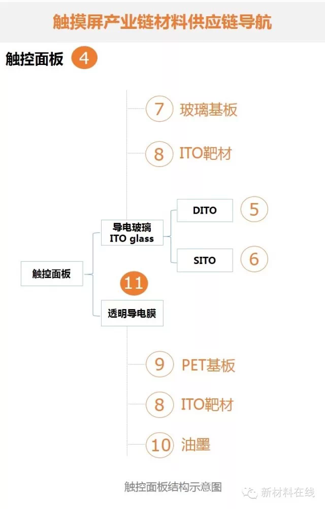 ① 盖板玻璃 中国南方工业集团公司 ② OCA光胶 广州市慧谷工程材料有限公司 ③ 导电银浆 锐新科 中科纳通 湖南利德电子浆料有限公司 上海安巅新材料科技 上海微谱化工技术 上海蓝沛新材料科技股份有限公司 ⑤ DITO 长信科技 ⑥ SITO 长信科技 ⑧ ITO靶材 韶关西格玛技术有限公司 四丰电子 深圳恒泰克科技有限公司 韶关西格玛...