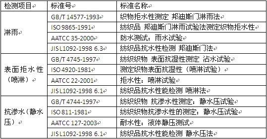 1. 防水性能测试标准 纺织品防水性能检测也称抗水性检测,主要分为抗水渗透性(静水压)检测、表面拒水性(喷淋)检测和淋雨测试,国内外常用的检测方法见下表1: 表1 国内外主要检测标准上表中的国家标准和日本JIS方法体系的技术方法基本上等效采用ISO,而AATCC方法检测方法与ISO 的主要不同之处在于:AATCC的静水压检测只要求至...