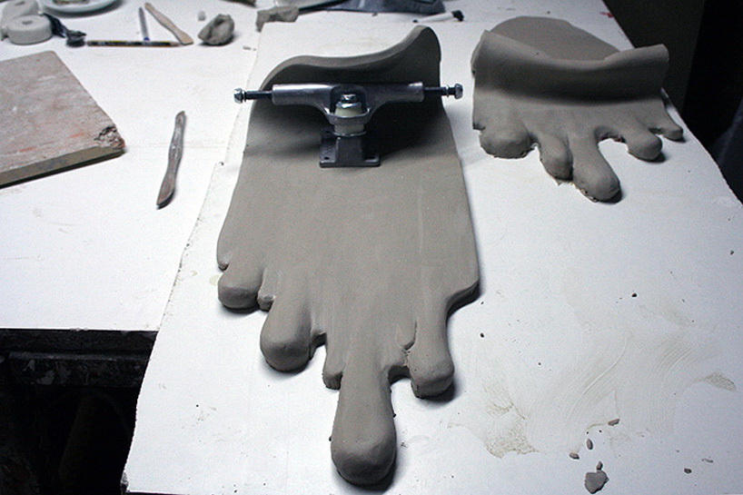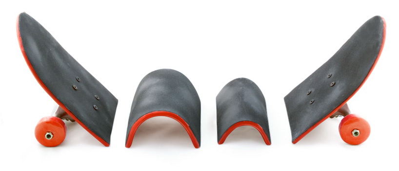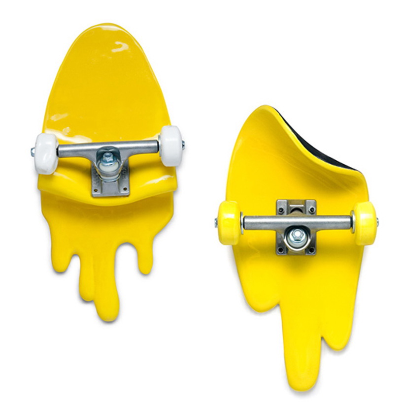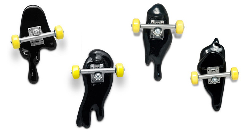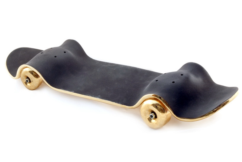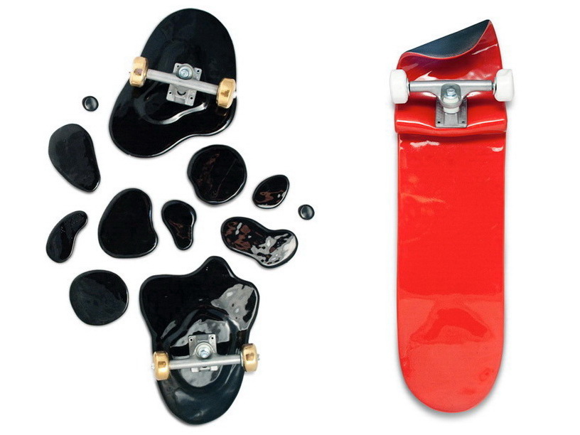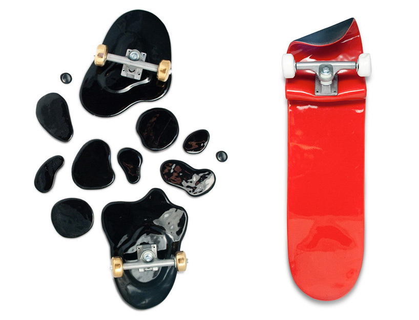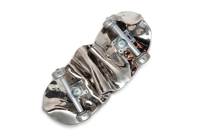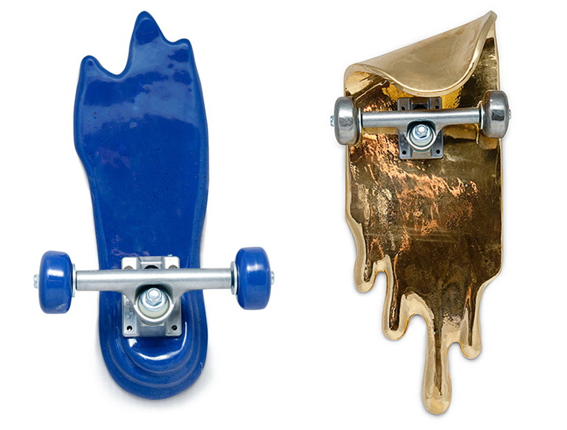 这是一组用陶瓷制作的艺术品,名为“坏掉的滑板”。这些滑板要么折断,要么弯曲,要么离奇地流淌渗漏起来,要么变成令人匪夷所思的形状。所有这些滑板都是陶瓷制造,有的是彩色抛光,有的是金银铝板面处理。